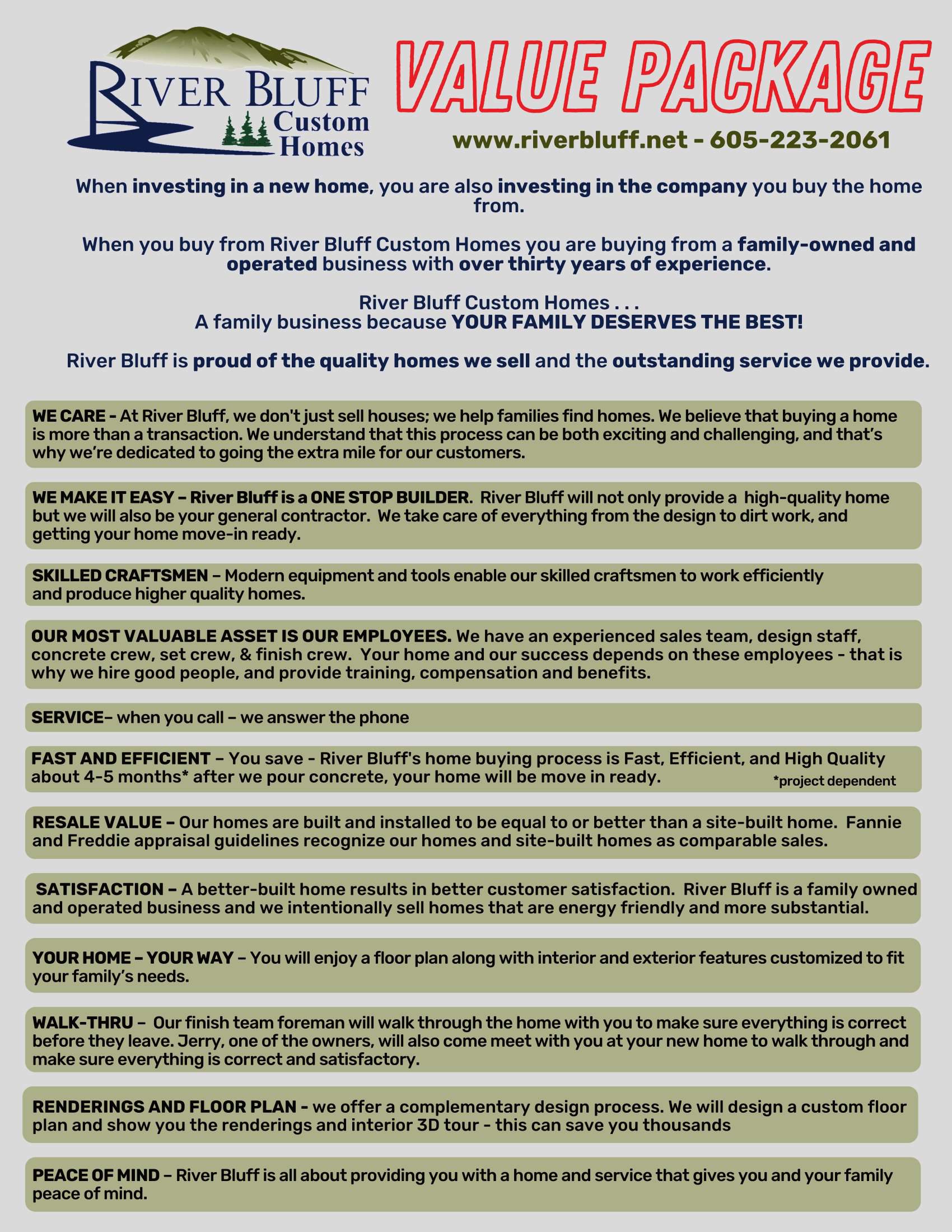 It’s our desire to help you and your family achieve your dreams of home ownership. At River Bluff Custom Homes, our years of industry knowledge and experience will provide you with a smooth home purchase.